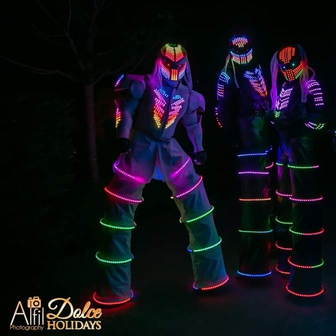 Le robot LED lumineux se distingue par son costume intégral recouvert de lumières LED programmables. Capable de changer de couleurs, de rythmes et d’intensité en fonction de la musique, il crée une ambiance dynamique et hypnotique. À Lorient, cette animation est particulièrement prisée pour les événements nocturnes, où les effets lumineux prennent toute leur ampleur.